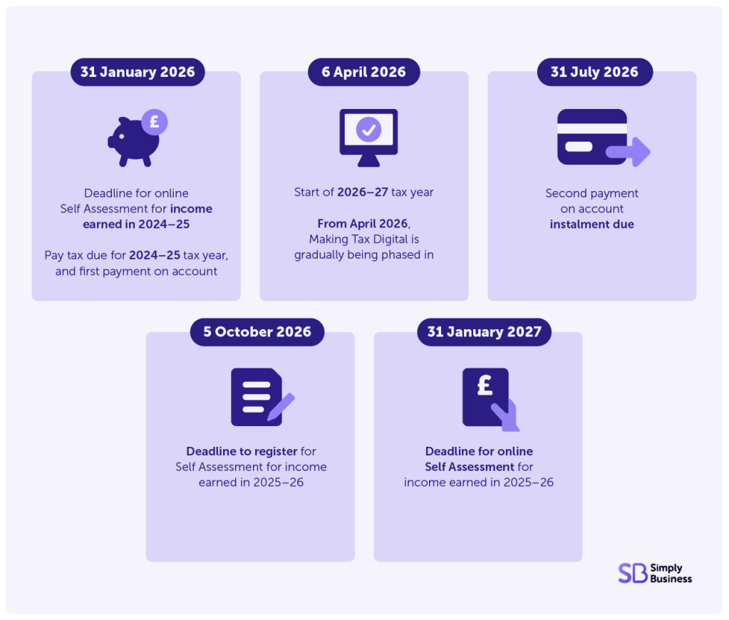 31 January 2026 | Deadline for online Self Assessment tax return for income earned in 2024-25 tax year Pay any remaining tax due for 2024-25 tax year, and first payment on account instalment |