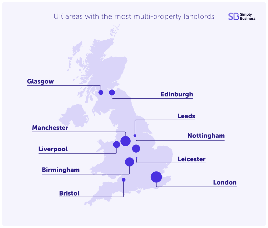 Similar to the HMO hotspots, it’s unsurprising to see that portfolio landlords focus on big cities with high rental demand and lots of property options to choose from.