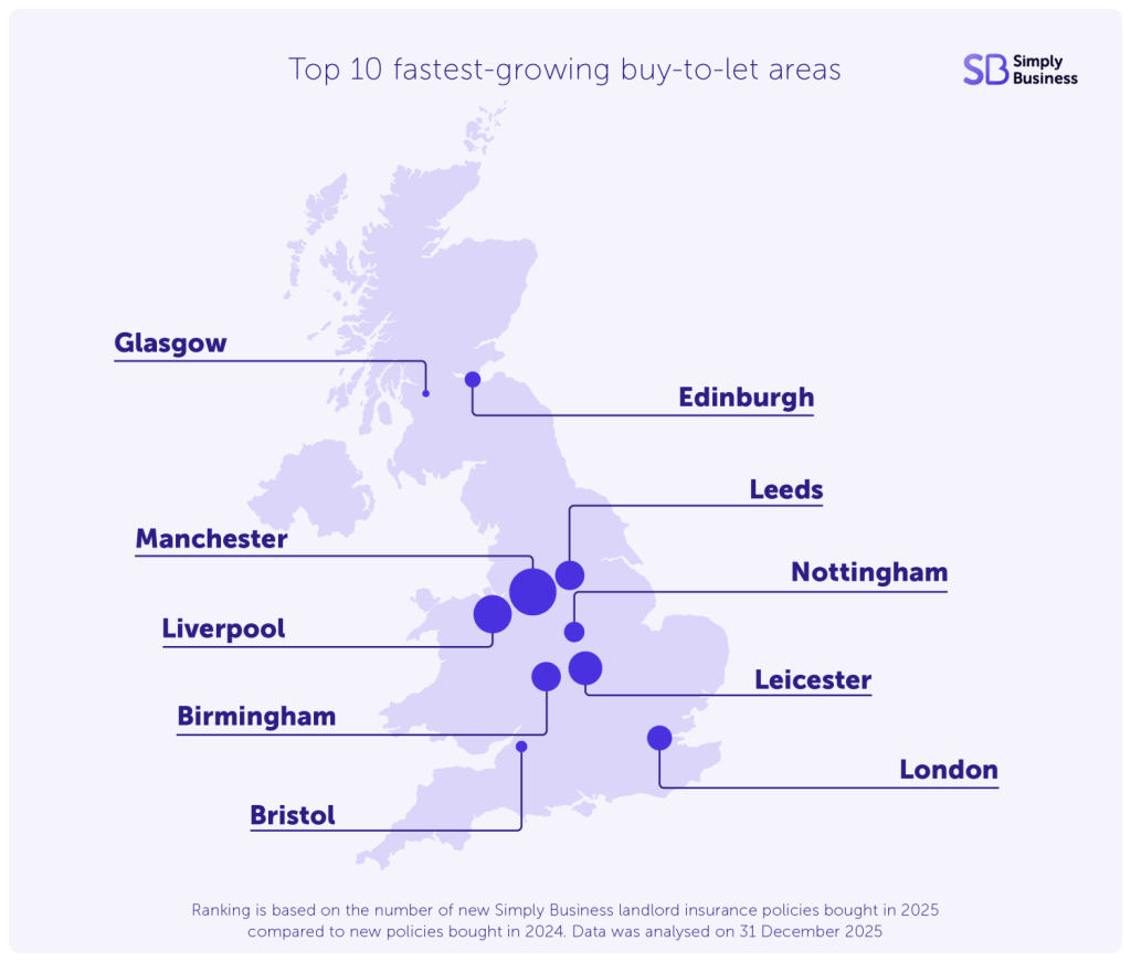 *Annual growth is the percentage difference between the number of new Simply Business landlord insurance policies bought in 2025 compared to new policies bought in 2024. Data was analysed on 31 December 2025